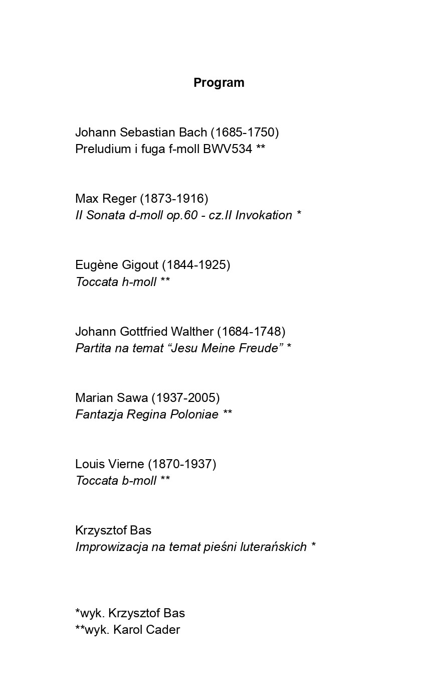 Jest to rozbudowany utwór zawierający ponad 10 wariacji - różnorodnych opracowań melodii luterańskiej pieśni Jezu ma radości znajdującej się w polskim śpiewniku ewangekickim pod numerem 795. Każda z wariacji była zagrana przy użyciu różnych głosów organowych co okazało różnorodne brzmienie starobielskiego instrumentu Sauera. Podczas koncertu zebrana publiczność miała okazję usłyszeć utwory z kręgu muzyki francuskiej XIX i XX wieku. Karol Cader zaprezentował wirtuozowską toccatę h-moll Eugéne Gigouta i toccatę b-moll Louisa Vierne'a.